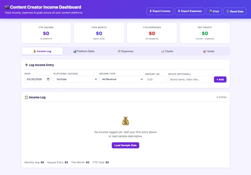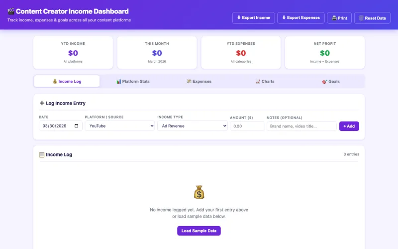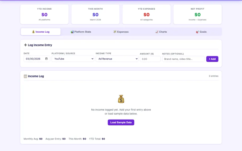 Track income across 14+ platforms including YouTube, TikTok, Substack, Patreon, Etsy, and more. Log earnings, track platform stats, manage expenses, and visualize your growth with interactive charts.