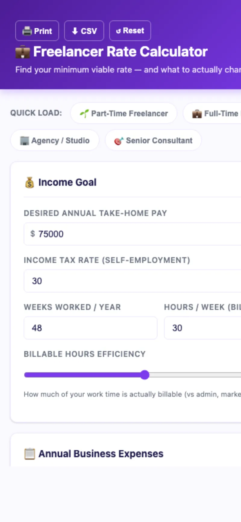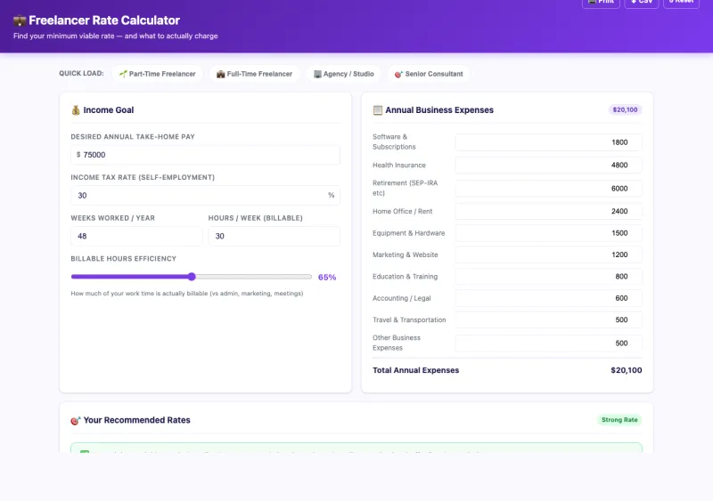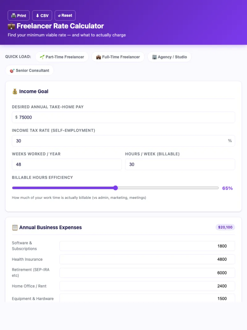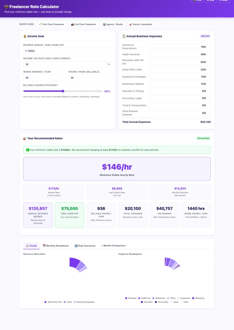 Calculate your ideal hourly and project rates with 4 quick-load scenarios. Accounts for taxes, insurance, non-billable hours, and efficiency rates. Compare your rate against market data.