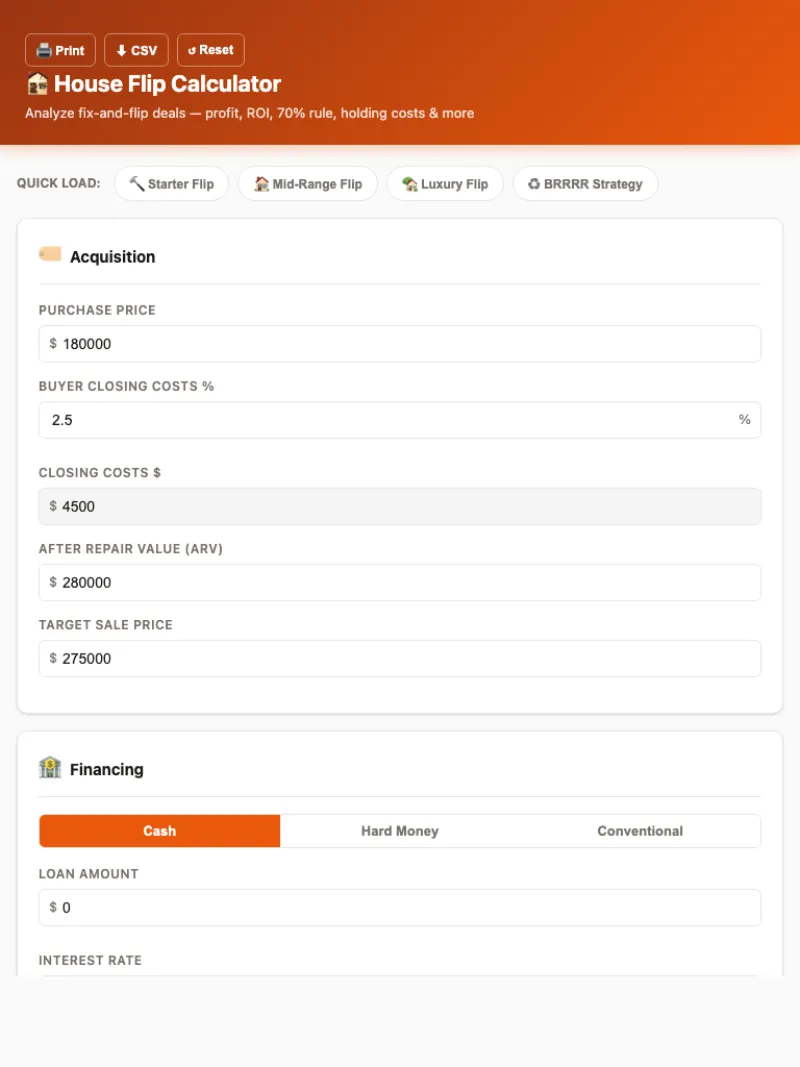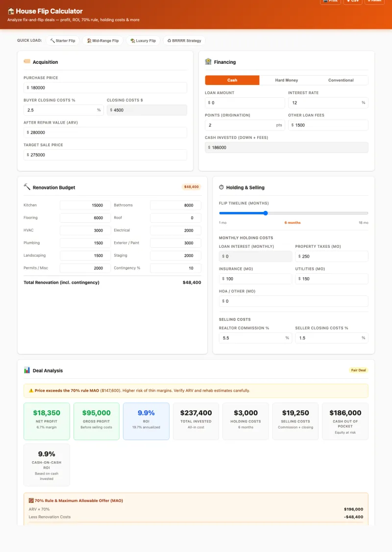 Professional-grade house flip analysis with 4 quick-load scenarios, 3 financing modes, the 70% Rule, and Maximum Allowable Offer (MAO) calculation. Know your profit before you buy.