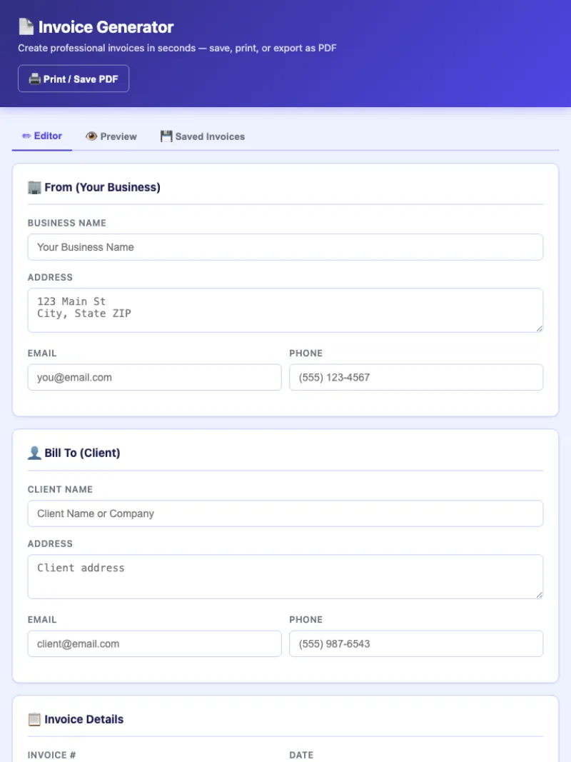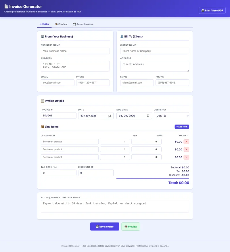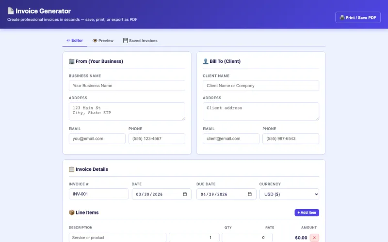 Create clean, professional invoices instantly. Fill in your info, add line items, and print or save as PDF. Business details auto-save for future invoices. Supports 5 currencies with tax and discount fields.