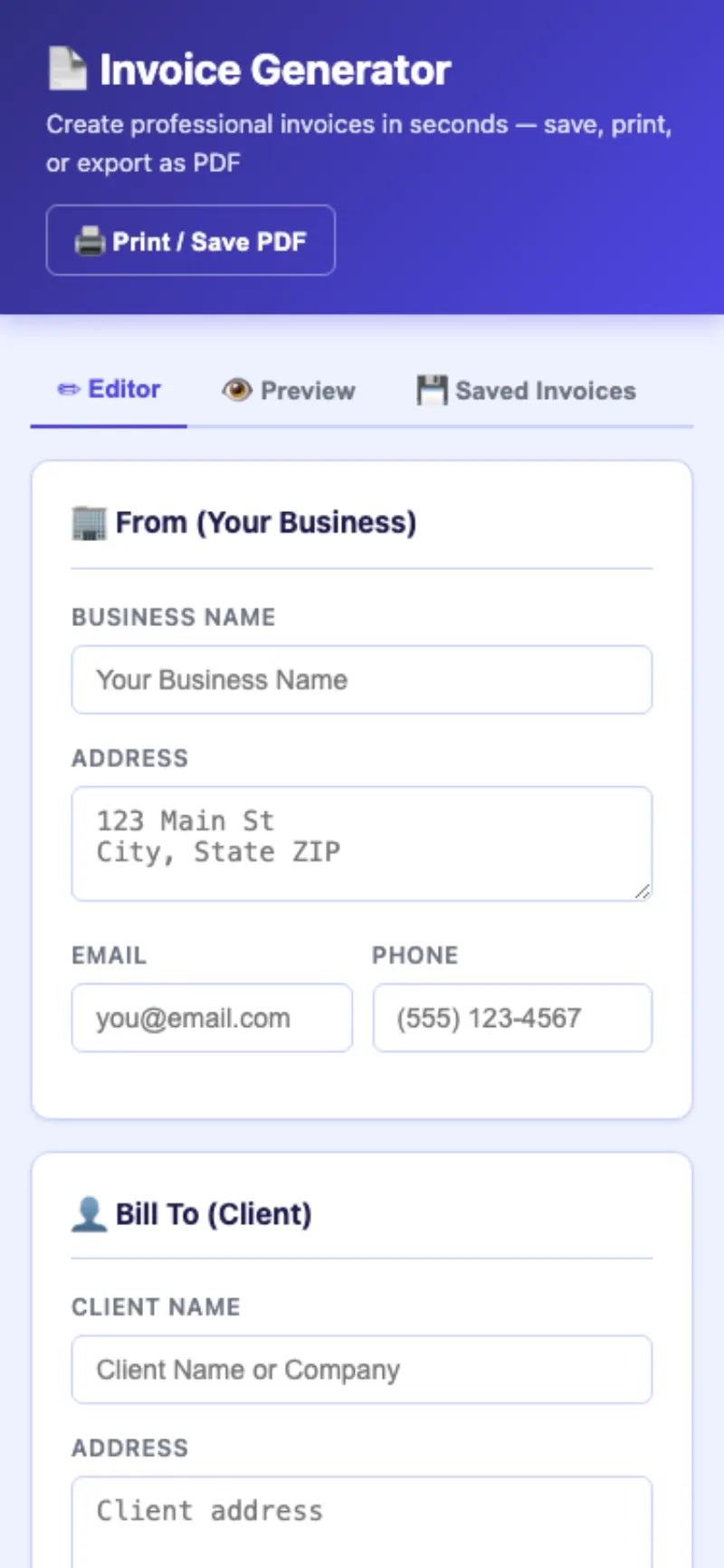 - Save and reuse business info across invoices