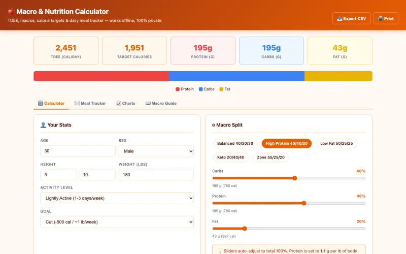 - 5 preset macro splits (Balanced, High Protein, Low Fat, Keto, Zone)