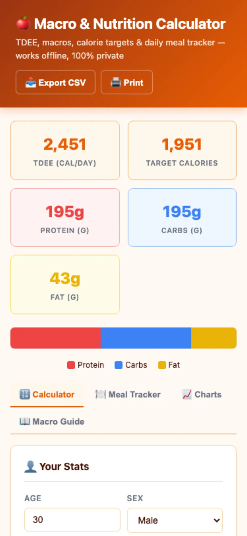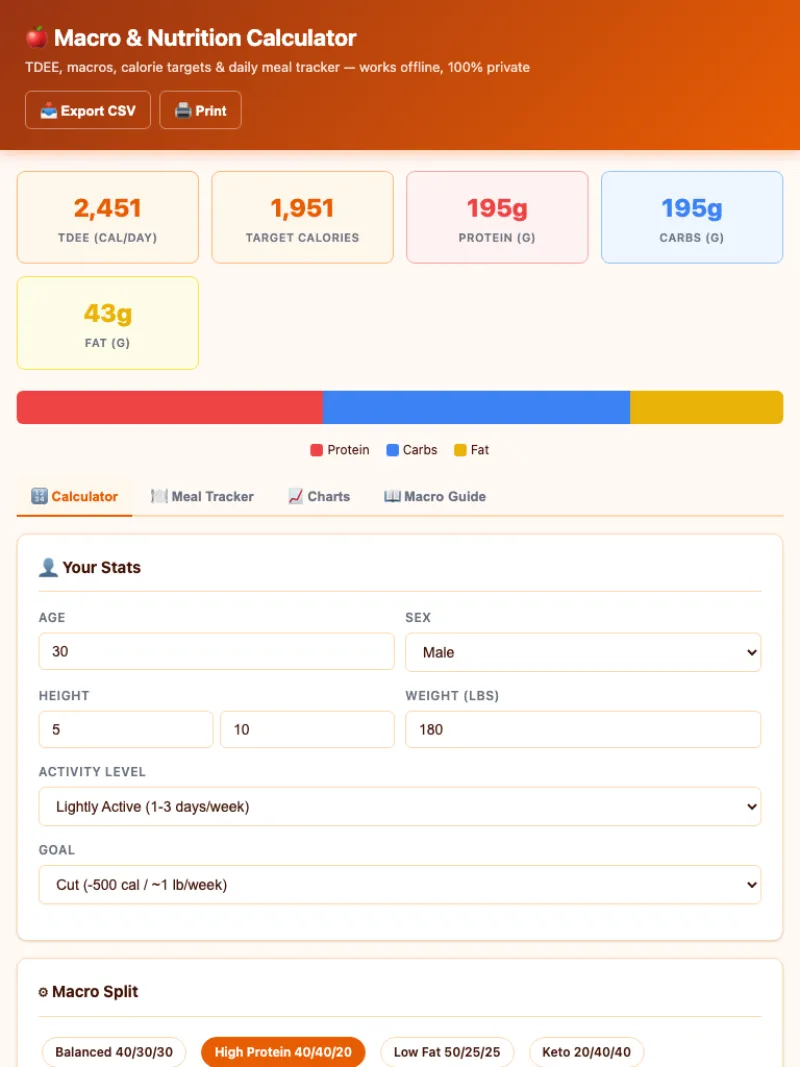 - Interactive macro breakdown and calorie balance charts