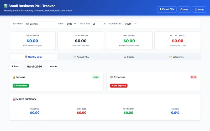 A complete profit & loss tracker with monthly entry, annual P&L statement, interactive charts, and customizable categories. Runs entirely in your browser with localStorage — your financial data never leaves your computer.
